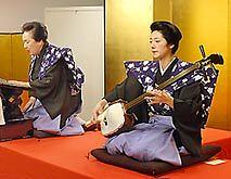 鶴沢寛也の弾く太棹(ふとざお)三味線の音に乗り、浄瑠璃の四代目竹本綾之助が「奥州安達原 袖萩祭文の段」を語り始めると、東京駅前の八重洲ブックセンターの一角に設けられた空間が一瞬にして東北の雪国に。